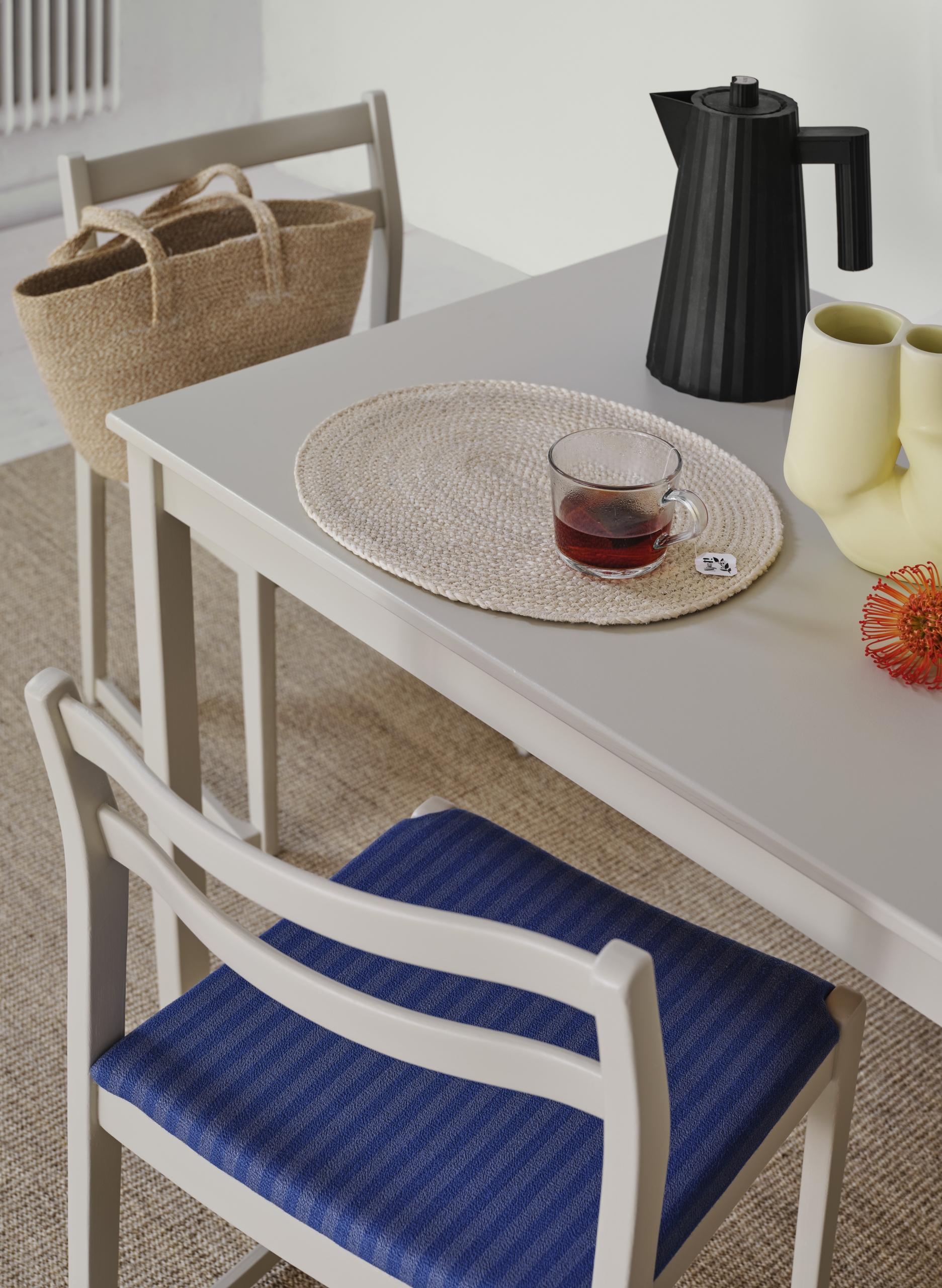 Bordstabletten Ella får sitt härliga uttryck genom att man kombinerar färgat och naturligt jutegarn. Ella svart/natur och vit/natur finns även som coasters. De ligger 6st i en matchande rund ask som passar fint för bordsflaskan.